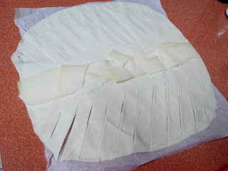 Estirem la pasta de full i si és rodona amb el corró li donem forma quadrada.